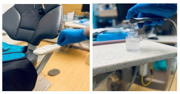 - Purge the dental unit with air at the end of each week and let dry. To do this, remove and empty the water bottle then reinstall it. Remove the handpicks. Hold the handpick tubing and air/water syringe over a sink or bucket and run until all water is purged from the system. Turn the unit off and allow to dry over the weekend.