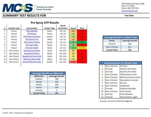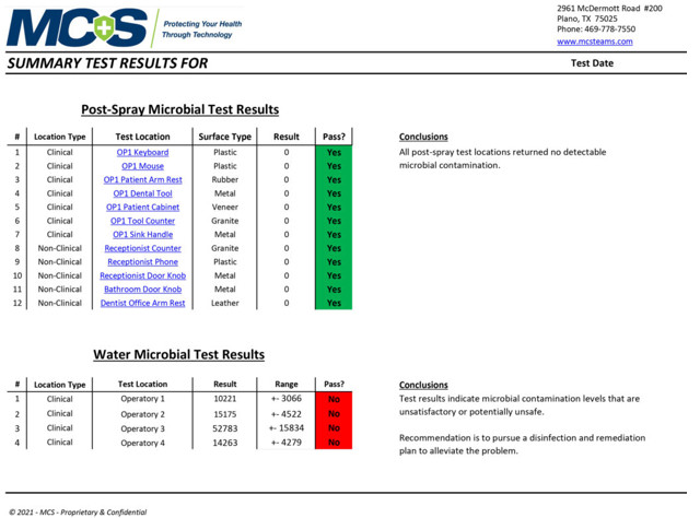 An MCS Infection Prevention Specialist will conduct multiple tests in key locations to determine the amount of active organic matter through industry-standard ATP and/or microbial testing procedures. The pre-spraying results will be documented and recorded as a baseline comparison. After the 2-step disinfection and protection treatment process is complete, a post-spraying test will be conducted on the same surfaces to verify the results of the cleaning/disinfecting process. (Below are sample pre- and post-test results provided by MCS to show data measurements. They do not reflect results specifically taken from our office.)